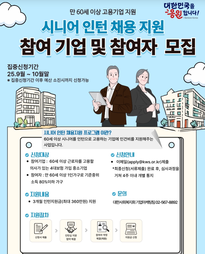 IBK기업은행과 함께 중소기업의 인력난 해소 및 노년층 일자리 기회 제공을 위해 시니어 인턴 채용 지원 프로그램 참여 기업 및 참여자를 다음과 같이 모집합니다.