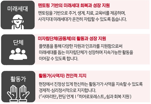 가정밖청소년, 다문화청소년, 자립준비청년, 고립은둔청년 등 여전히 사각지대에 놓인 미래세대가 존재합니다.