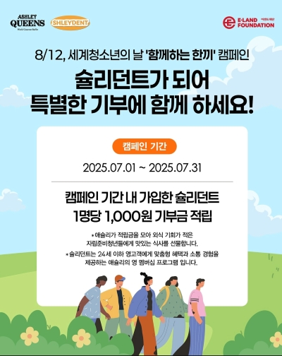 캠페인은 7월 1일부터 7월 31일까지 진행됐으며, 애슐리 앱을 통해 24세 이하 신규 멤버십 ‘슐리던트 클럽’ 가입 시 고객 1명당 자동으로 1,000원이 기부금으로 적립되는 방식으로 운영되었습니다.